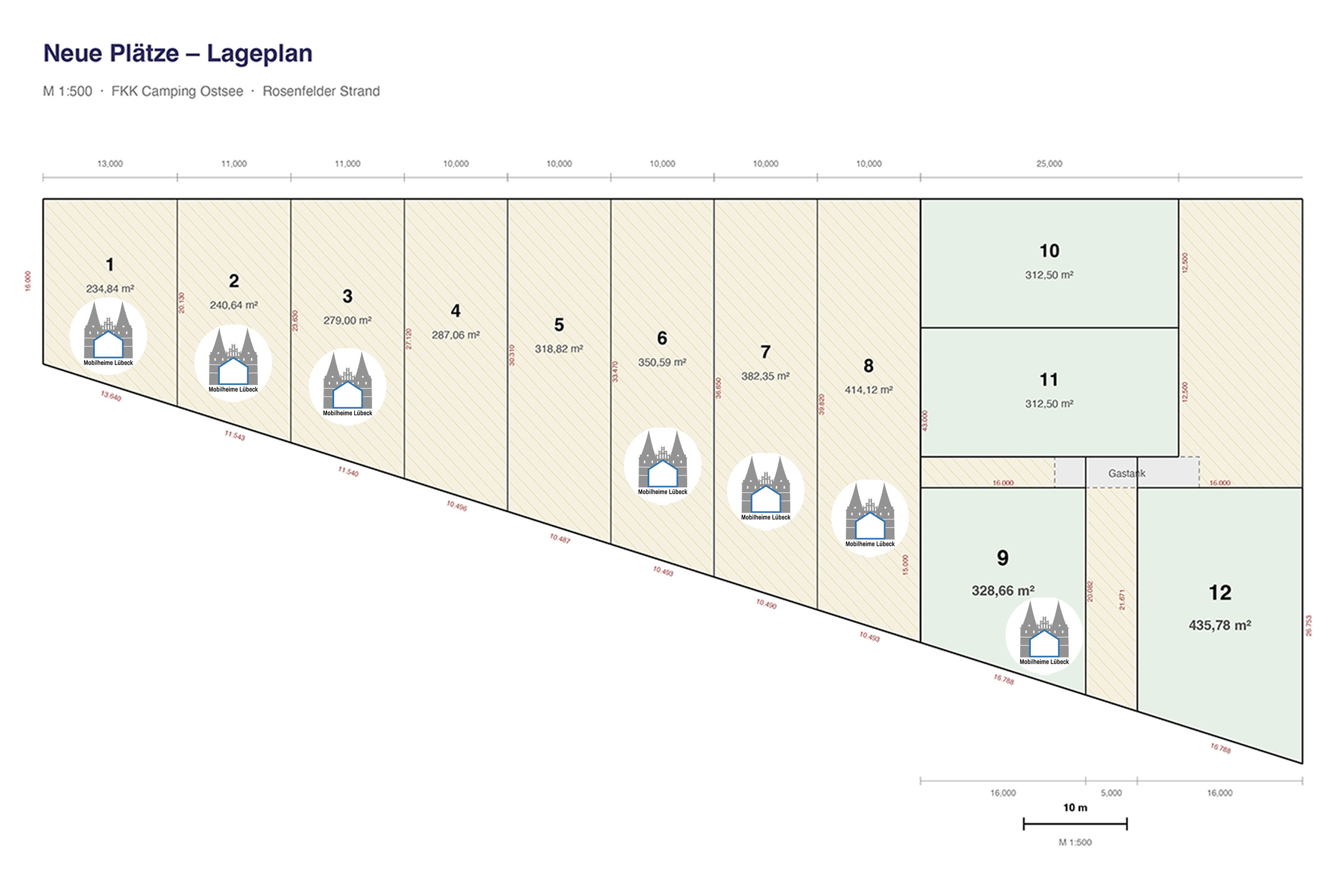 • Größe der Parzelle: 240 m² für Mobilheime bis 60 m² zzgl. 12 m² überdachter Terrasse